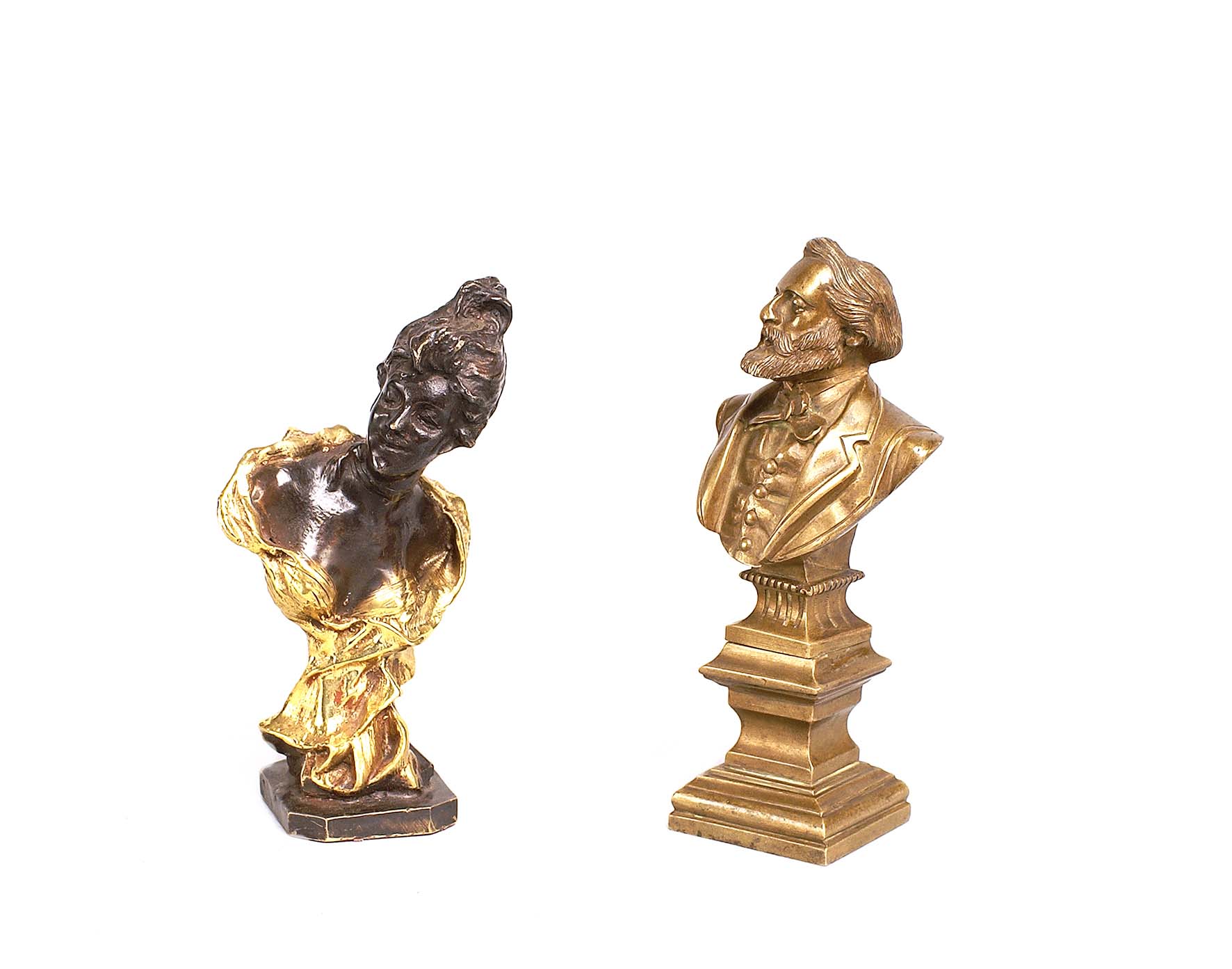 Scuola francese della fine del XIX secolo, lotto composto da due busti in bronzo patinato e parzialmente dorato, misure diverse.