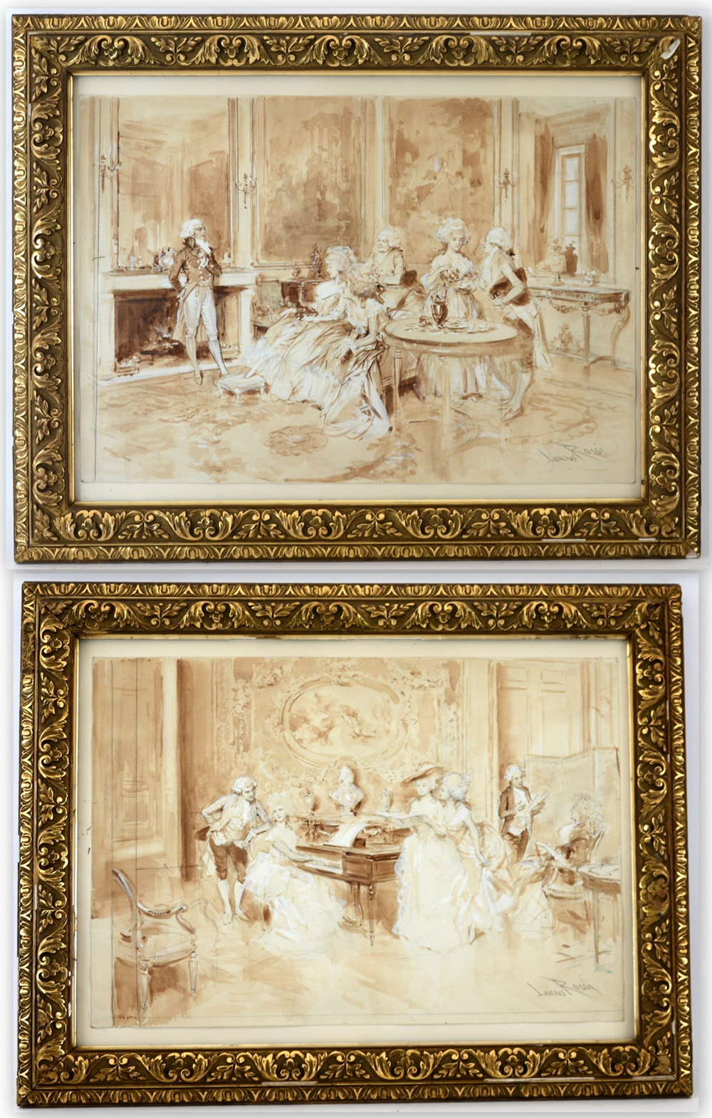 Lucius Rossi (Roma 1846 - Parigi 1913) "Interni ottocenteschi" coppia di acquerelli monocromi (cm 35x50) Firmato in basso a destra. In cornici