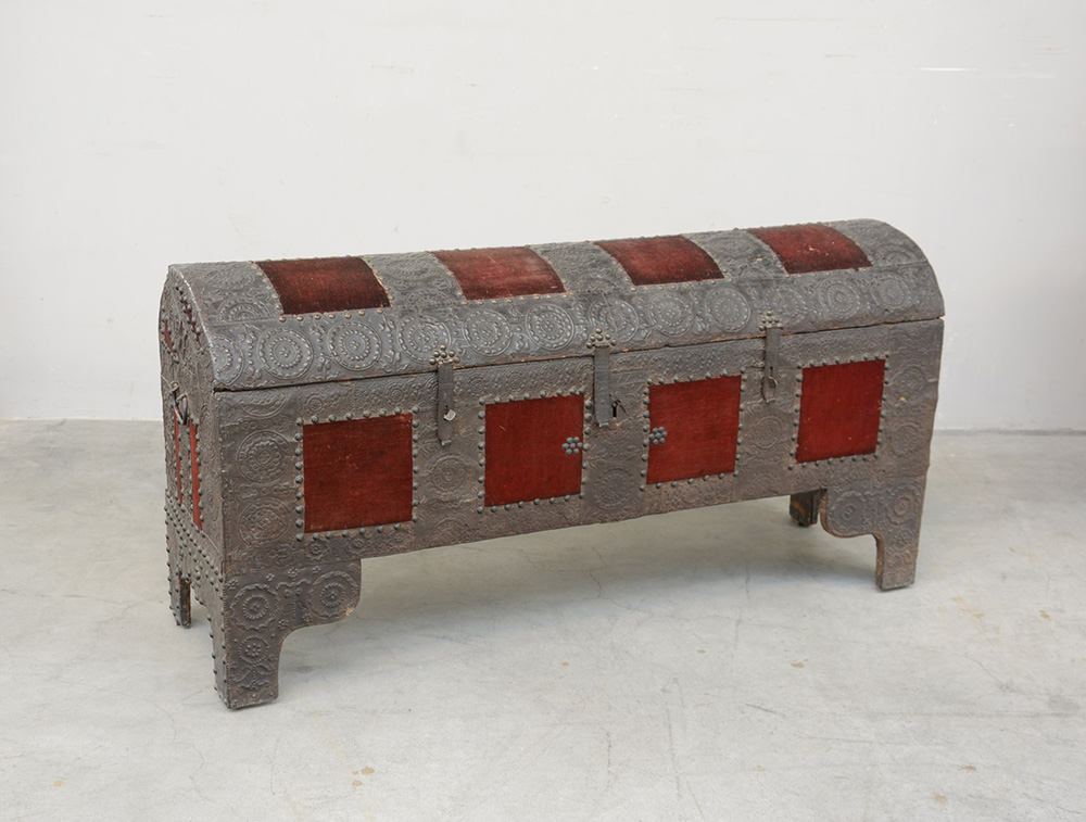 Baule da corredo ricoperto in cuoio e ferro battuto, con borchie e inserti in velluto rosso, piedi a mensola. Italia, sec. XVII (cm 133x67x41) (difetti e restauri)