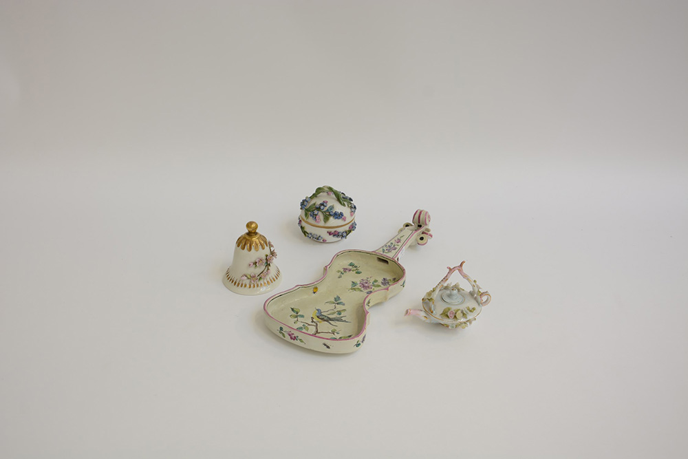 Manifattura diversa lotto composto da vassoietto in forma di violino, una scatola e due oggetti diversi in ceramica e porcellana (difetti e restauri)