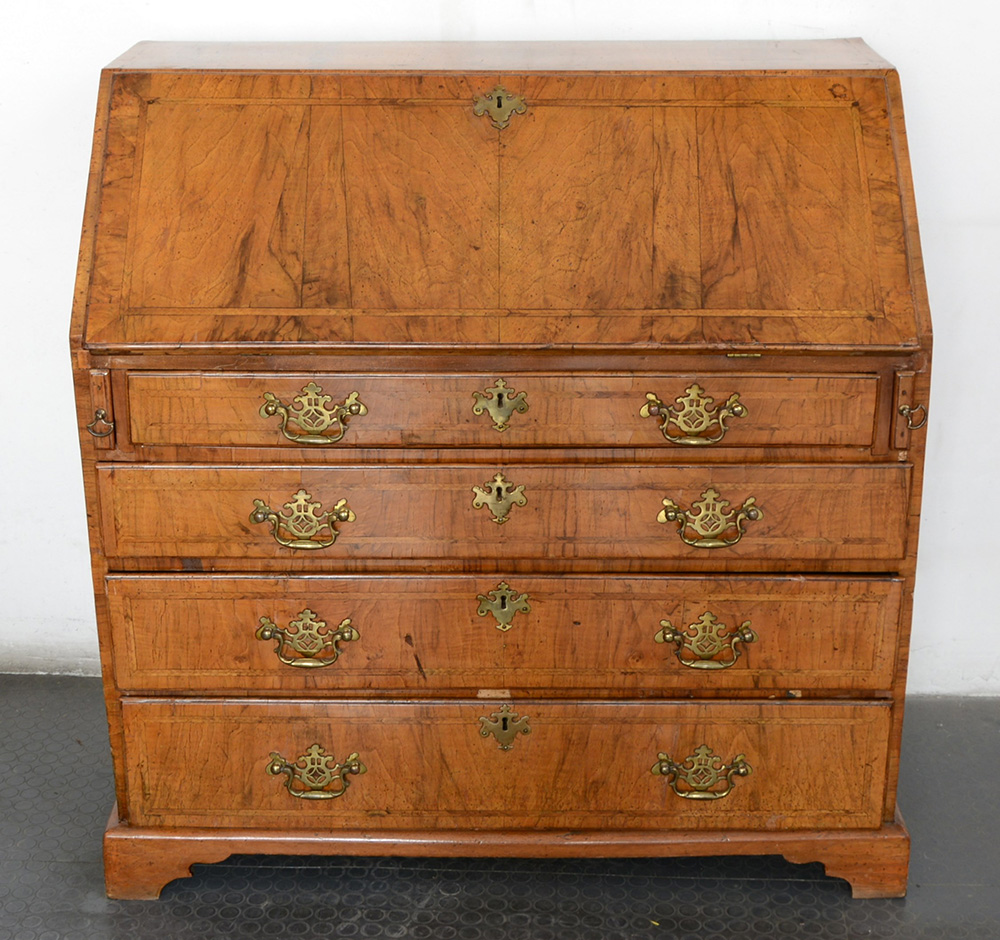 Ribalta lastronata in mogano e filettata a spina di pesce ad un cassetto piccolo nella fascia e tre grandi sul fronte. Anta ribaltabile celante scarabattolo con cassettini, vani e colonne. Piedi a mensola. Inghilterra fine sec. XVIII (cm 98x100x53)(difetti)