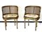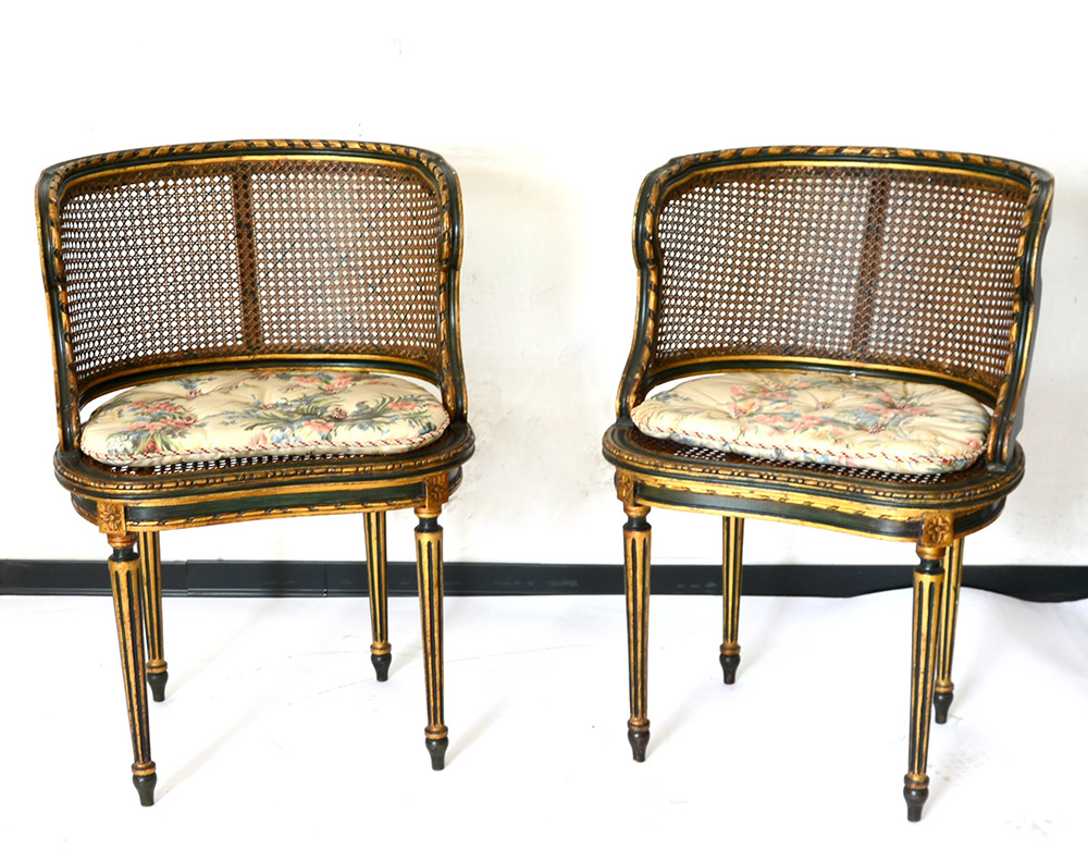 Coppia di poltroncine a pozzetto in legno intagliato, laccato e dorato, seduta e schienale incannucciati (difetti)