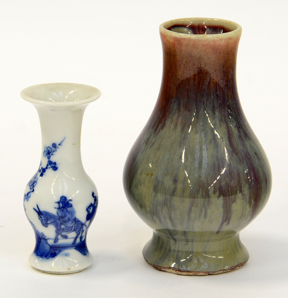 Due vasetti in porcellana, uno con invetriatura flambË, l'altro con decoro...