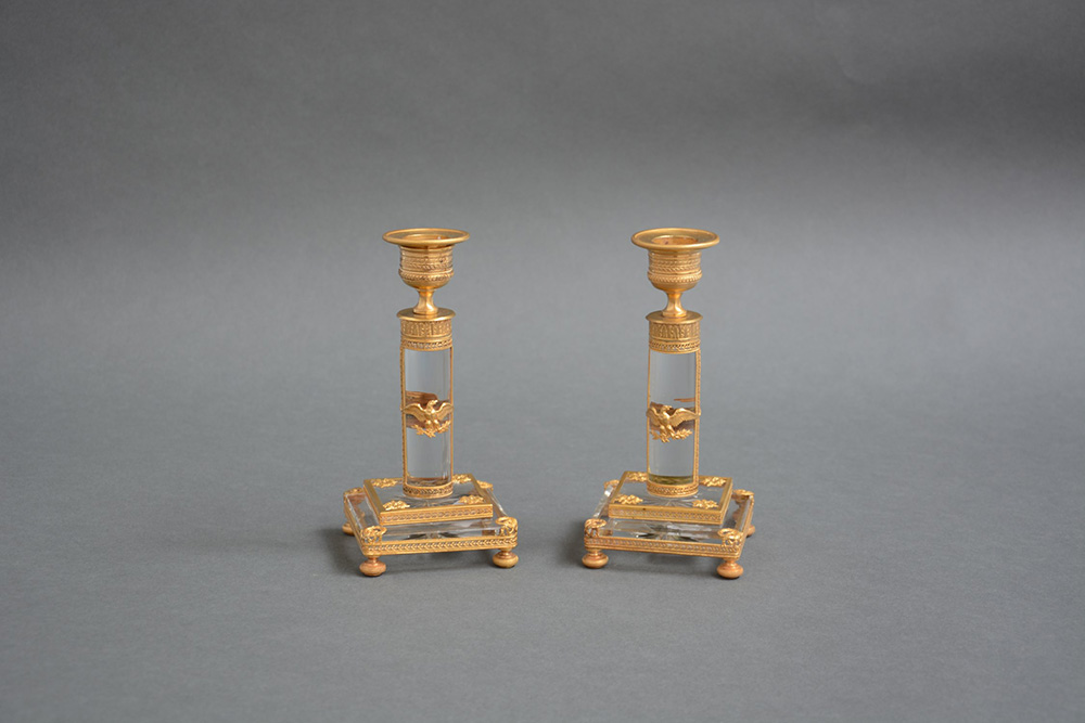 Coppia di candelieri in cristallo decorati in stile impero ad aquile e...