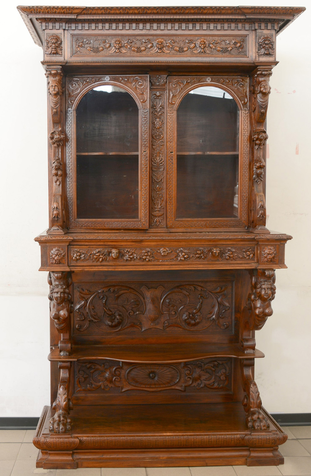 Mobile a due corpi in rovere. Parte superiore con due ante a vetro con fasce intagliate a raffaellesche, parte inferiore ad un cassetto ed una mensola con montanti sagomati ed intagliati a figure alate (cm 110x200x53)