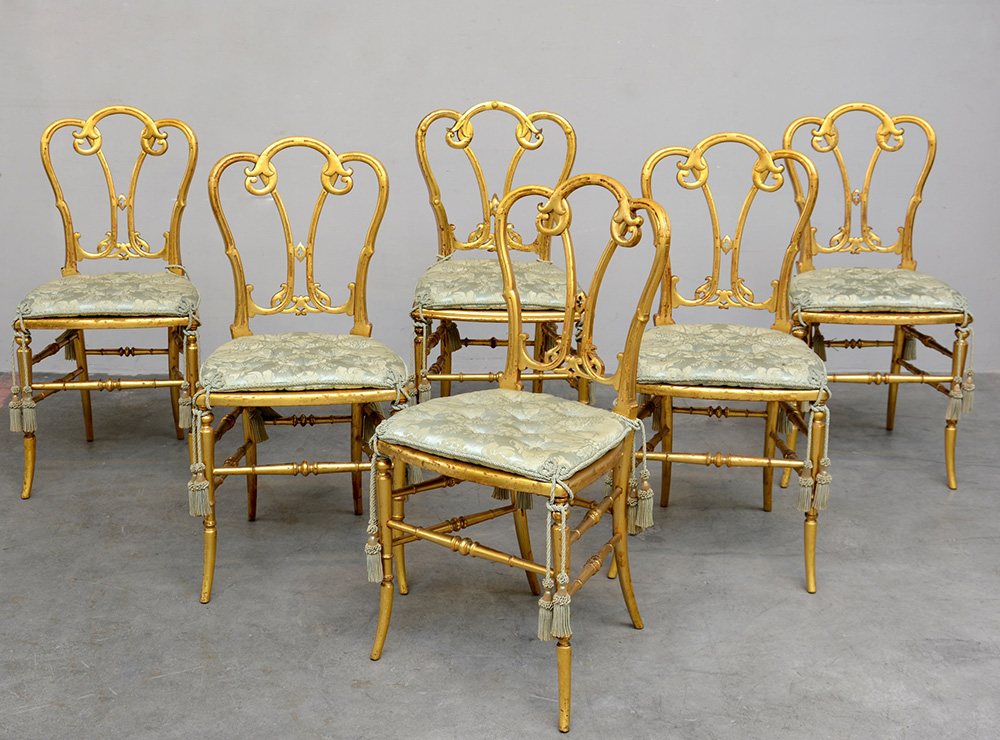 Gruppo di sei sedie chiavarine in legno tornito e dorato, gambe unite da traverse, schienale traforato a motivi a volute, fine del sec. XIX (lievi differenze)