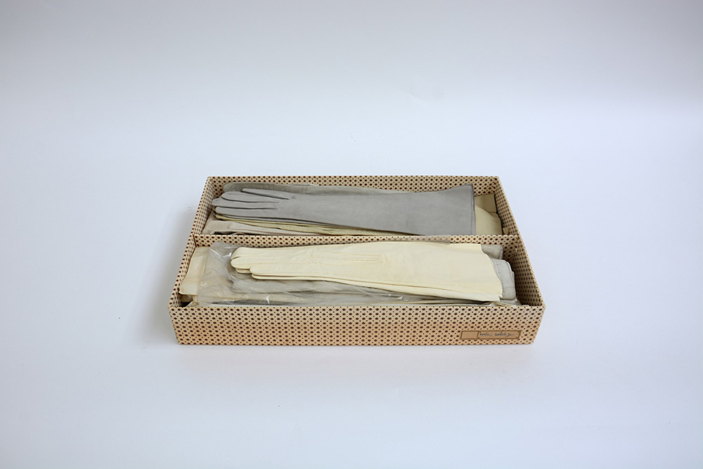 Scatola contenente numerose paia di guanti nei toni panna e pastello di...