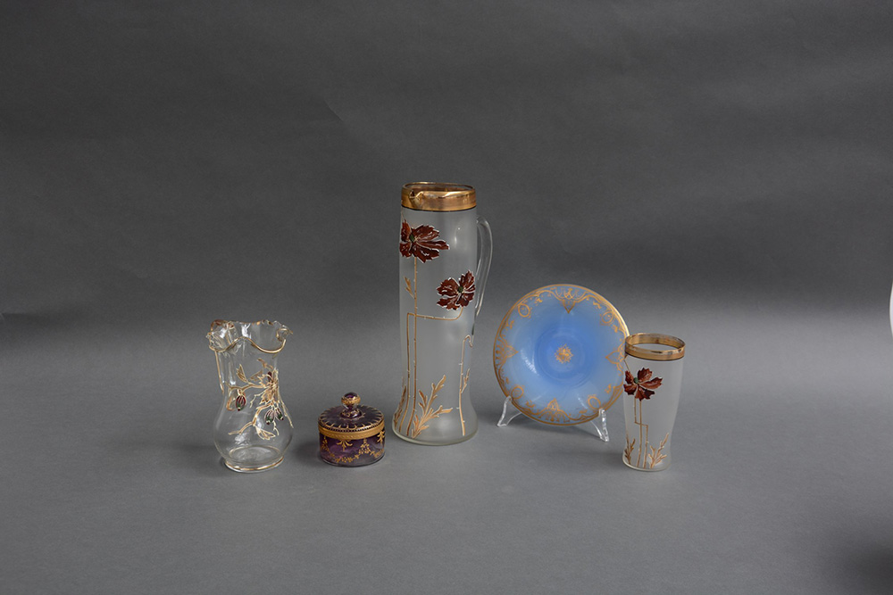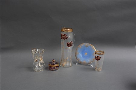 Manifatture diverse. Lotto composto due brocche, un bicchiere, un piatto e una scatola con coperchio in vetro decorato a dorature e fiori policromi