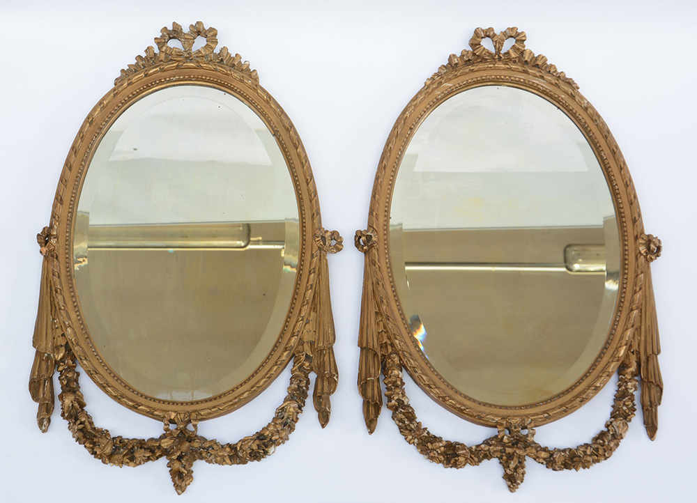 Coppia di specchiere di forma ovale con cimasa intagliata e dorata a fiocco, la parte inferiore decorata con fregio a ghirlanda floreale e panneggi (cm 80x48) (difetti e mancanze)