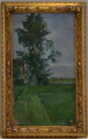 Firma indecifrata "Paesaggio" olio su tela applicata a cartoncino (cm...