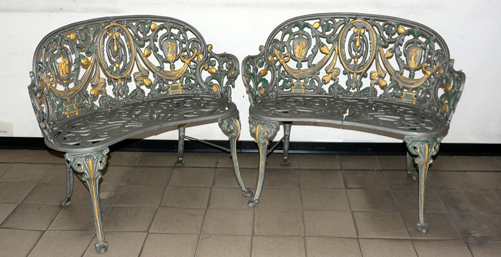 Coppia di piccole panchette da esterno in ghisa con schienali decorati con vasi, pigne e figure mitologiche (cm lungh. 90 x h 75) (difetti)