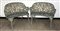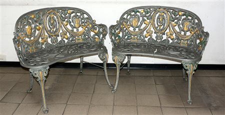 Coppia di piccole panchette da esterno in ghisa con schienali decorati con...