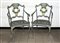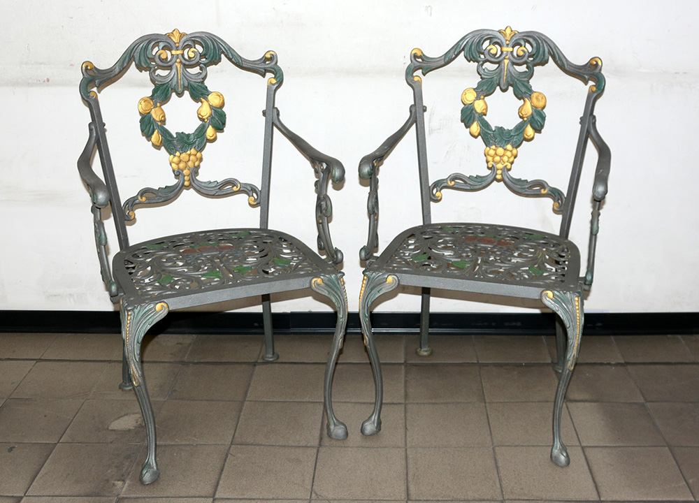 Coppia di poltrone da giardino in ferro, schienale e braccioli di forma sagomata, decorata da frutti e foglie in dorate e laccate