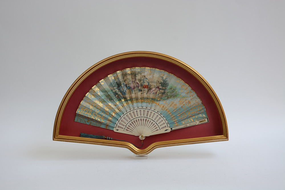 Ventaglio con stecche in avorio traforato a motivi stilizzati, pagina in carta decorata a scena galante in un paesaggio. Contenuto in teca di epoca posteriore