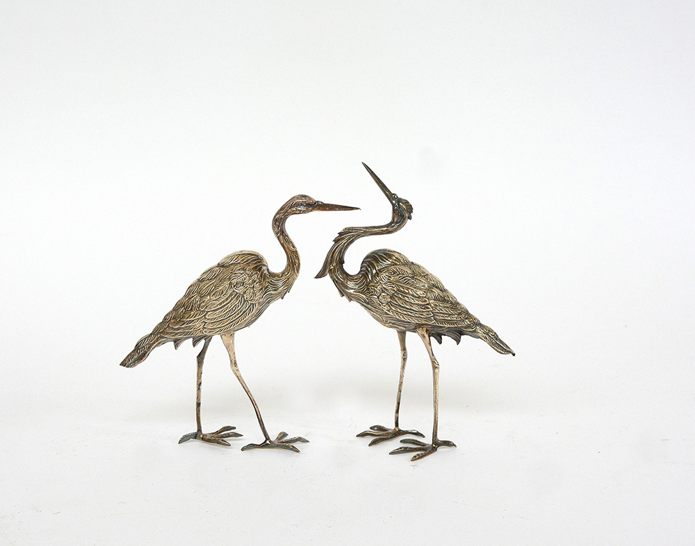 Coppia di aironi in argento. Spagna, sec. XX (gr 130 ca.) (h. cm 17,5) (lievi difetti)