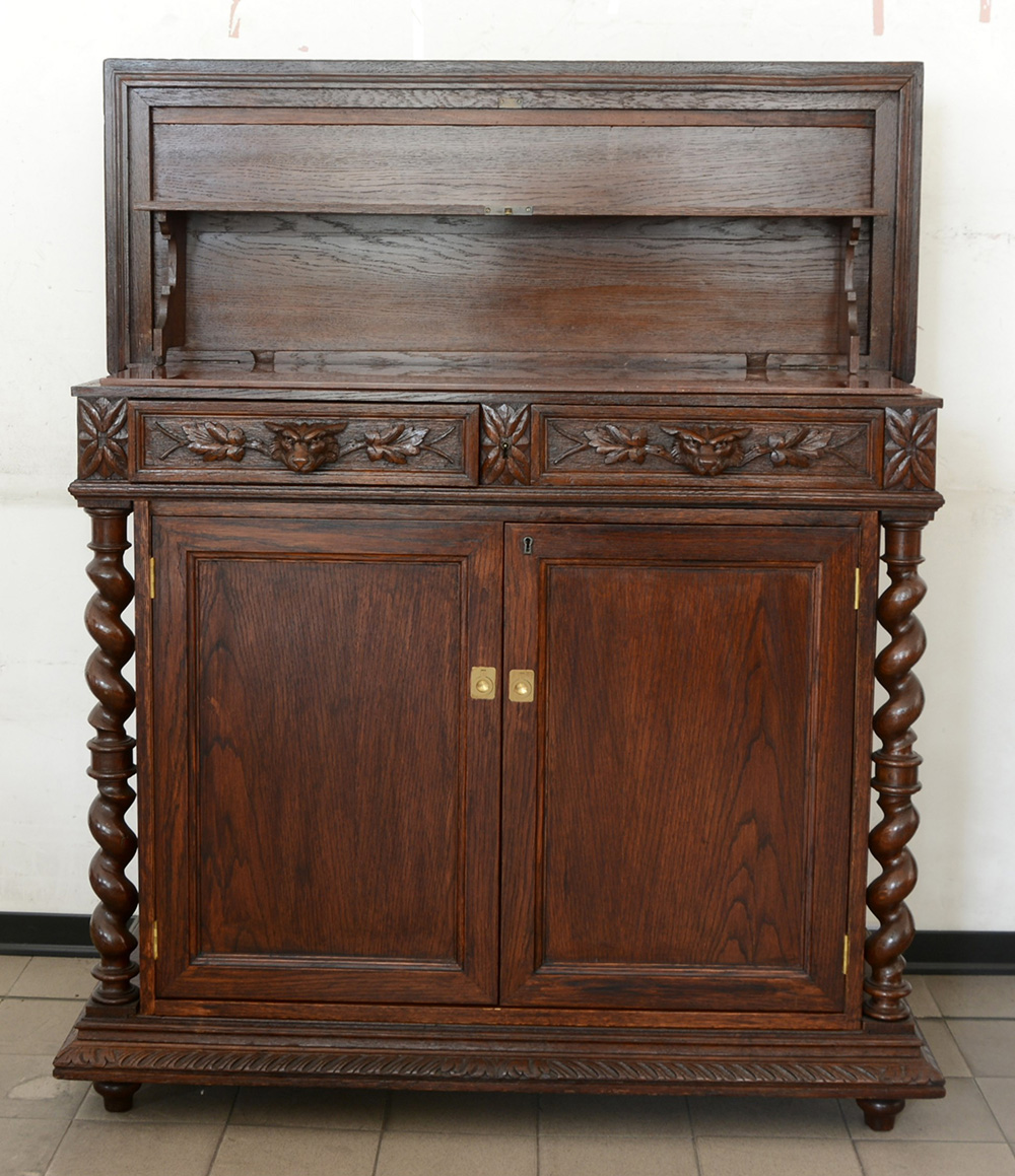 Credenza a due ante e cassetti intagliati a fiori e mascheroni, piano apribile celante marmo e piattaia, montanti a torciglione (cm 114x96x40)