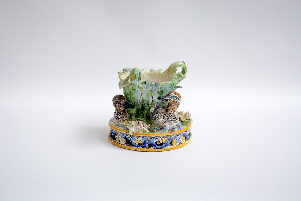 Centrotavola in maiolica decorata a rilievo ad anatre in uno stagno (h. cm 18) (difetti e mancanze)
