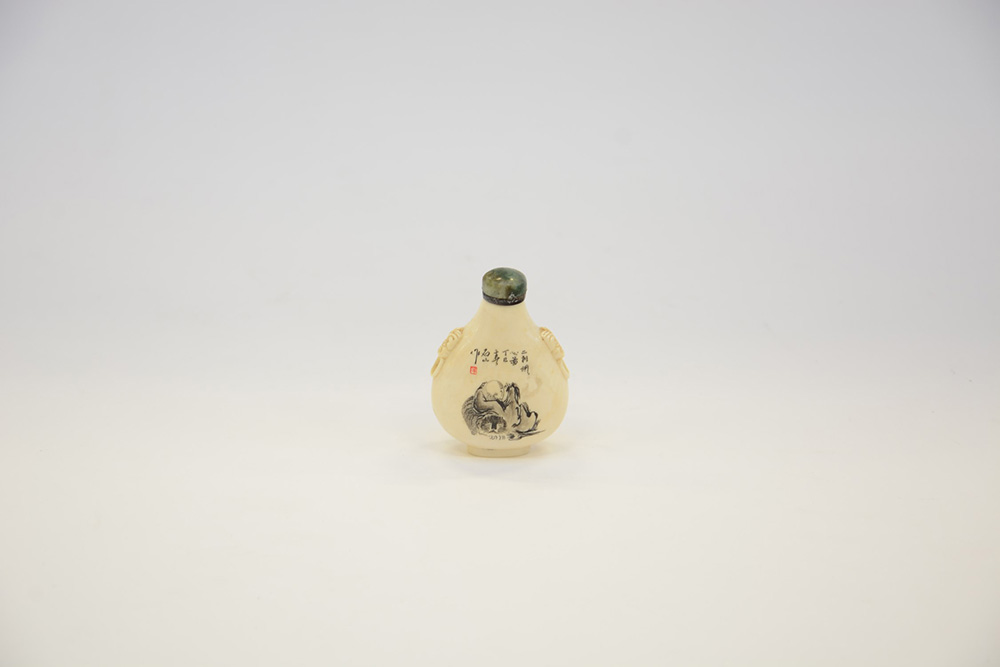 Snuff bottle in avorio decorato con monaco e una tigre con iscrizione...