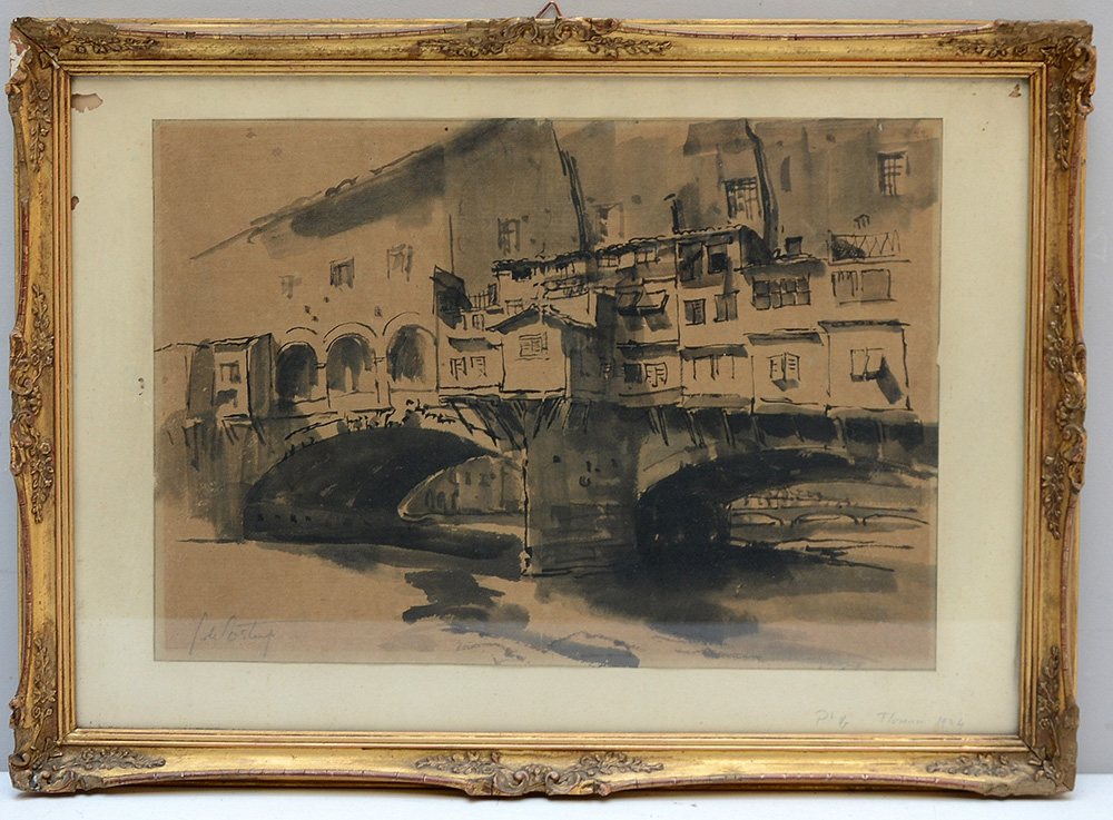 Firma indecifrata, "Firenze, ponte Vecchio", china nera su carta (cm 31x44) firmato in basso a sinistra, in cornice (difetti)