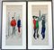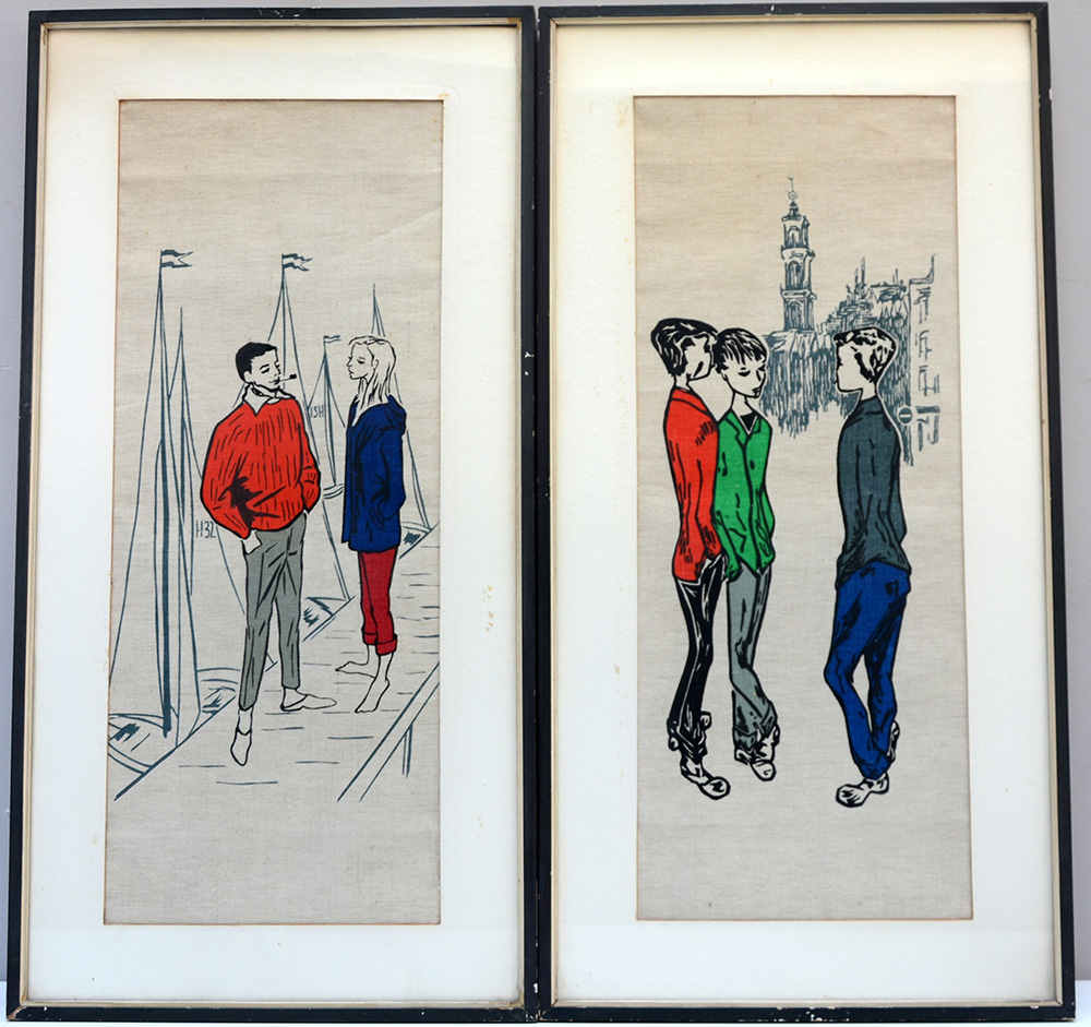 Ignoto, lotto di due serigrafie su tessuto raffiguranti ragazzi in conversazione (cm 60x25), in cornici (difetti)