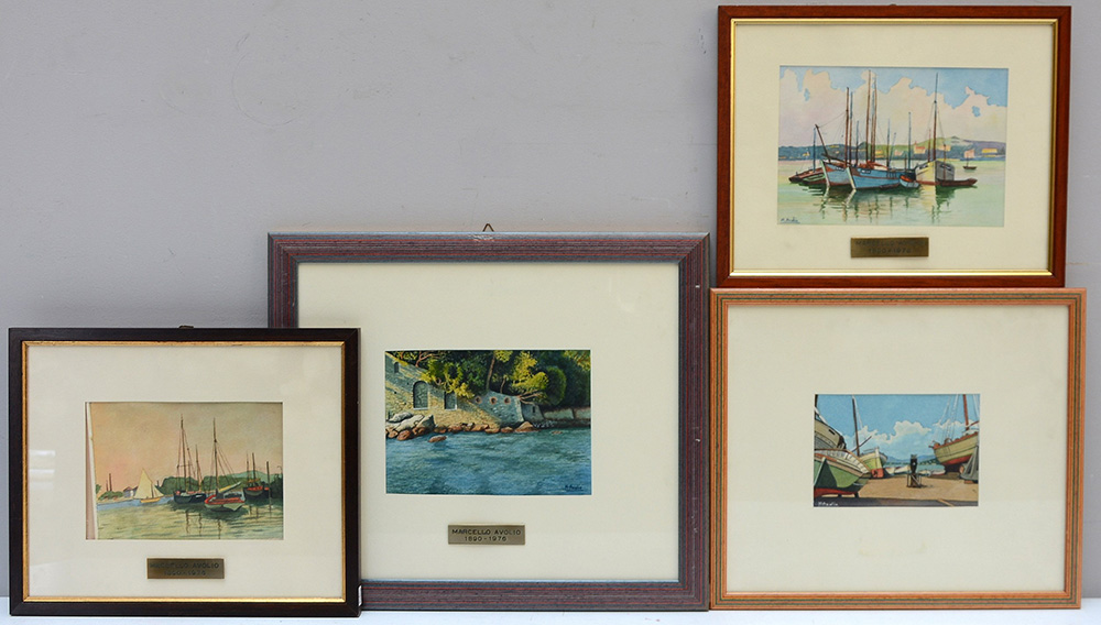 Marcello Avolio Lotto di otto acquerelli di soggetto e dimensioni differenti, firmati e siglati, in cornici (lievi difetti)