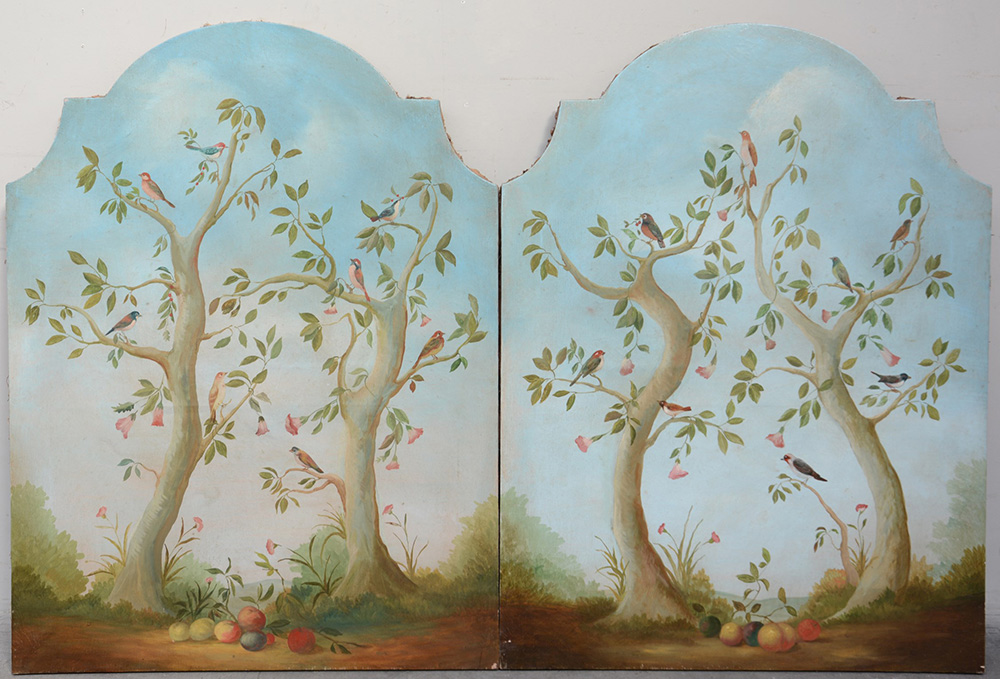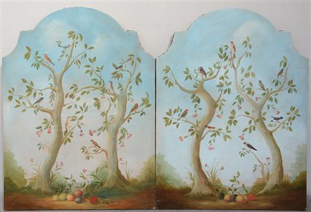 Ignoto, "Alberi con uccelli e frutta" coppia di dipinti ad olio su tela sagomata (cm 123x91)