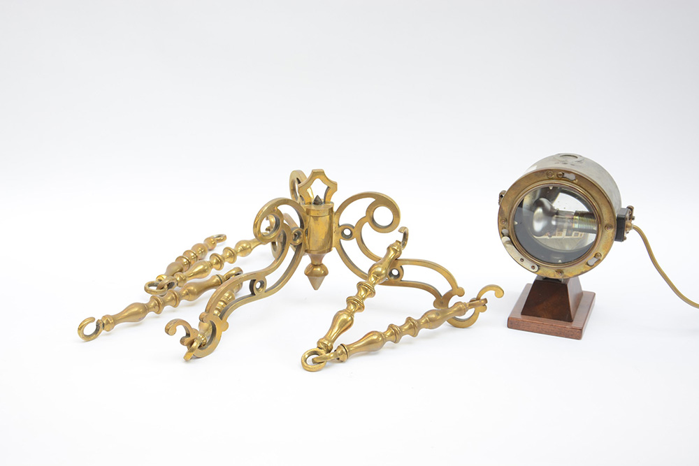 Lotto composto da una lampada inglese per segnalazioni e un elemento decorativo a sospensione in ottone (difetti e mancanze)