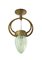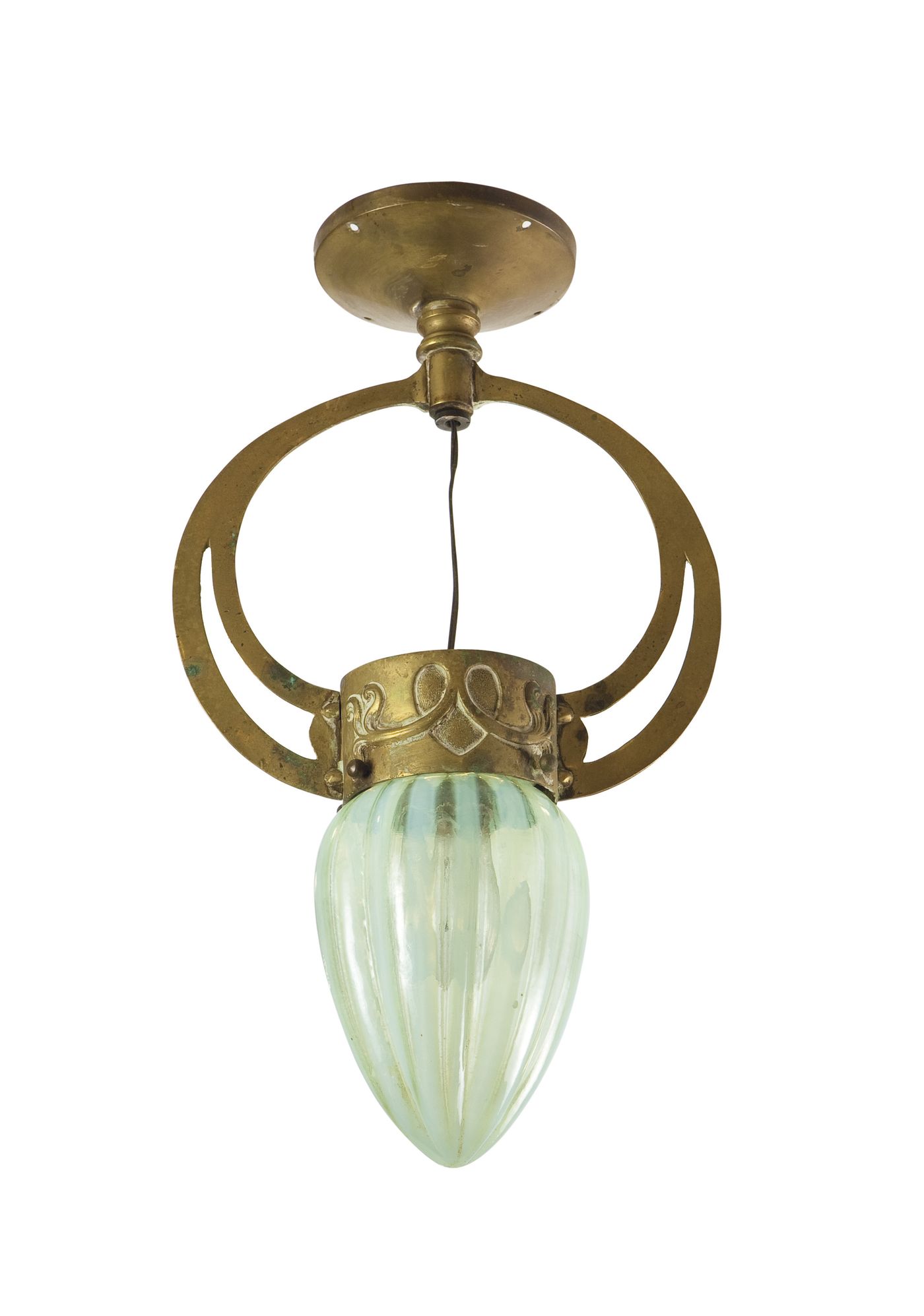 LAMPADARIO - Lampadario a plafone in stile floreale. Montatura in fusione d’ottone parzialmente cesellata, diffusore in vetro iridescente. 1900 circa. H cm 40