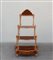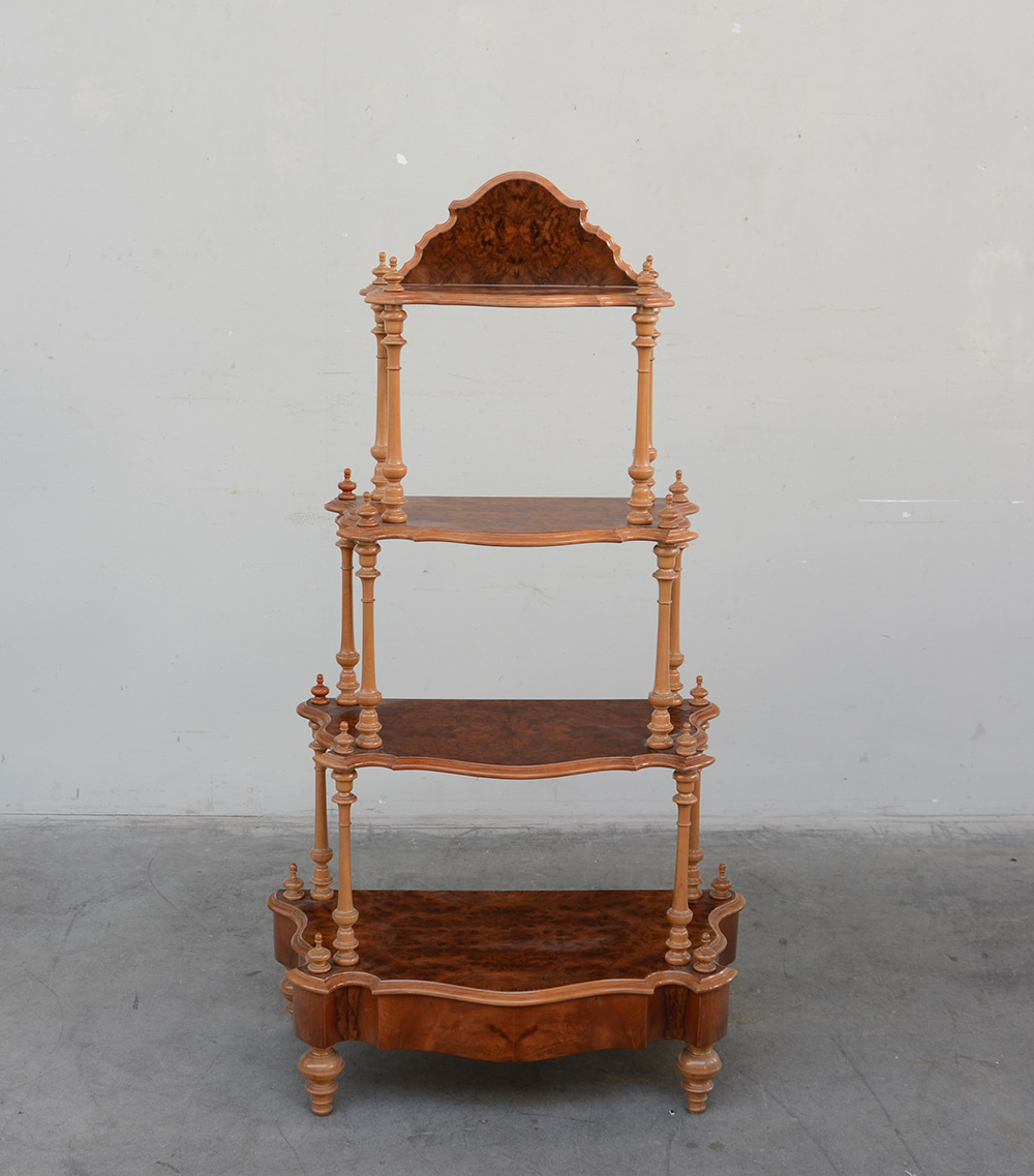 Etagere di forma sagomata a quattro ripiani lastronato in radica con montanti torniti (cm 80x135x40) (difetti)