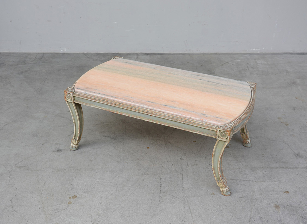 Tavolino da salotto in legno laccato con gambe sagomate terminanti a zampa caprina. Piano in onice (cm 86x35x47) (difetti)