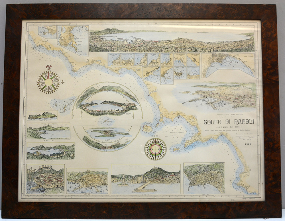 Grande incisione raffigurante il "Golfo di Napoli con i piani dei porti" (cm 69x92) firmata a lapis Delfino in basso a destra, esemplare n. 23/100, in cornice (difetti)