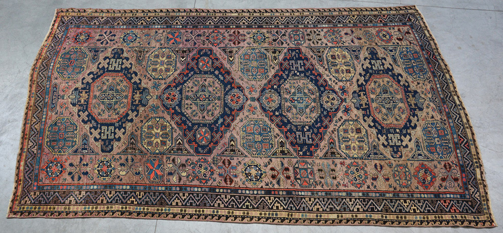 Tappeto Sumak, fine sec. XIX disegno a quattro medaglioni nei toni del blu, azzurro e arancio su fondo nocciola (cm 330x225)(difetti e rapature)