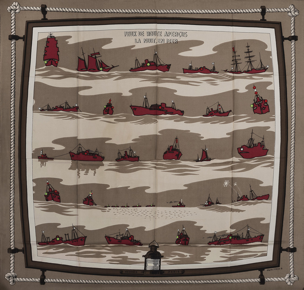 Foulard in seta, tema nautico su fondo color beige (difetti)