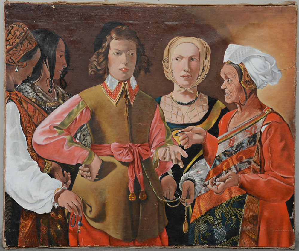 Ignoto, "Scena d'interno con figure", olio su tela (cm 100x120) (difetti)