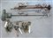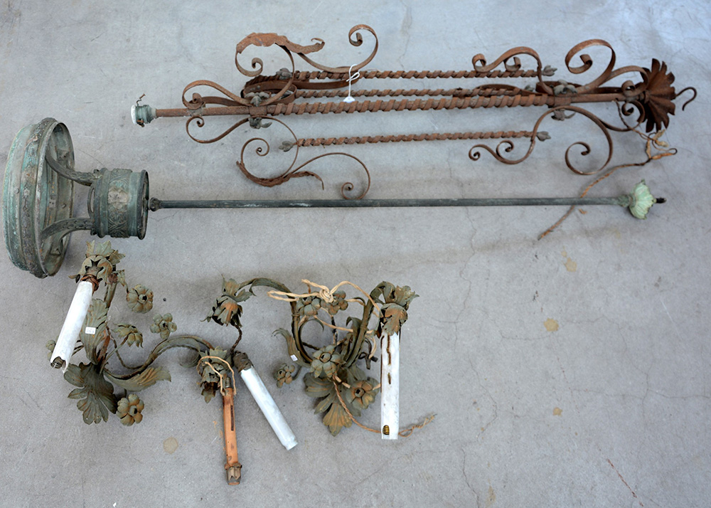 Lotto composto da due applique a due luci con foglie e fiori in lamiera di ferro, e due strutture per lampade a sospensione in ferro battuto, inizio sec. XX (difetti e mancanze)