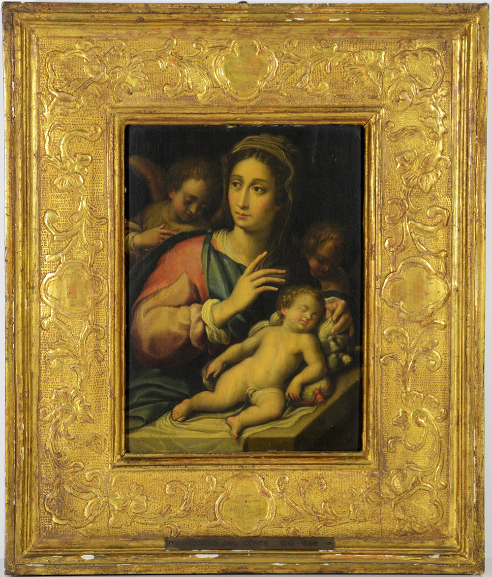 Scuola da Jacopino Del Conte "Madonna con bambino e angeli"olio su tavola (cm 26x19). Iscritto Jacopino Del Conte al retro. In cornice (allegato expertise)