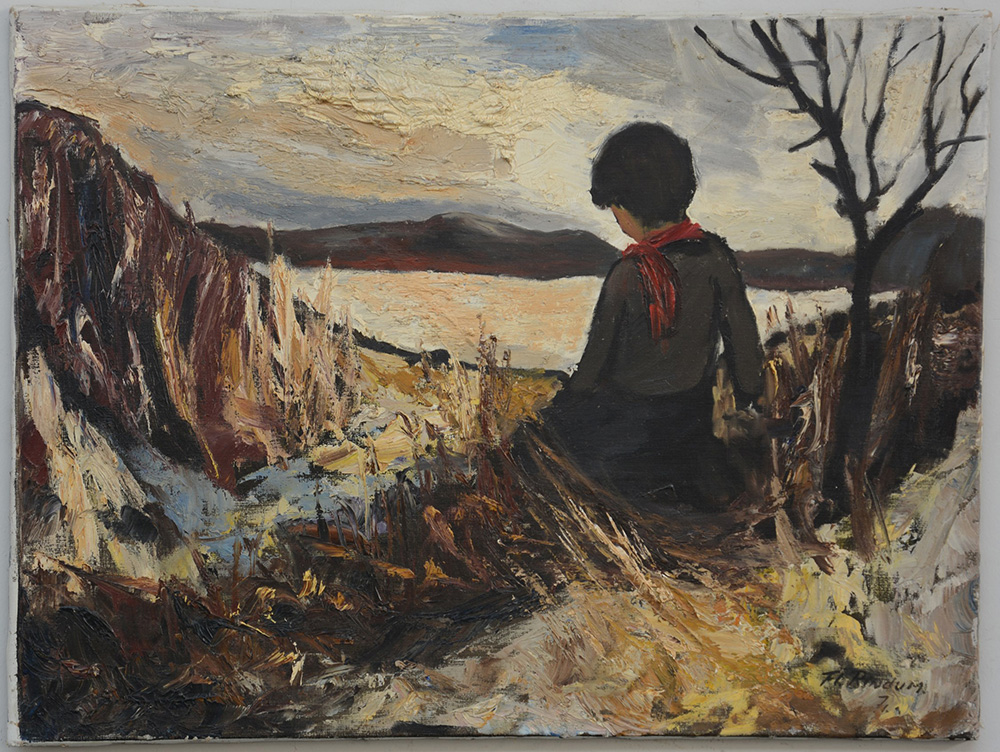 Lotto 1684 | Firma indecifrata, "Paesaggio lacustre con bambina", olio su tela (cm 60x80),...