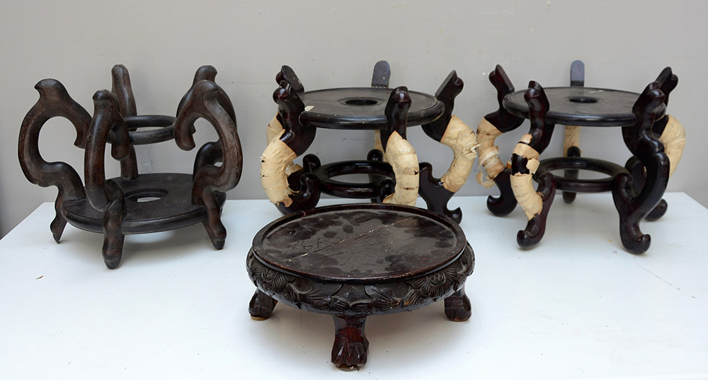 Lotto di quattro basi porta cachepot orientali in legno scuro (porta d cm 26) (difetti)