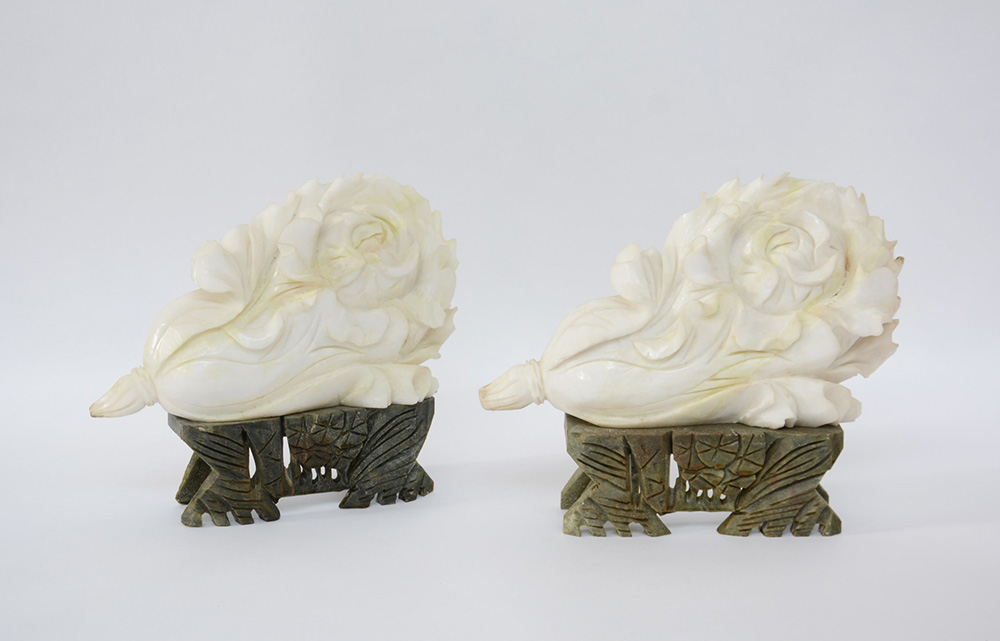 Lotto 1687 | Lotto composto da due sculture in pietra dura raffiguranti fiori e foglie...