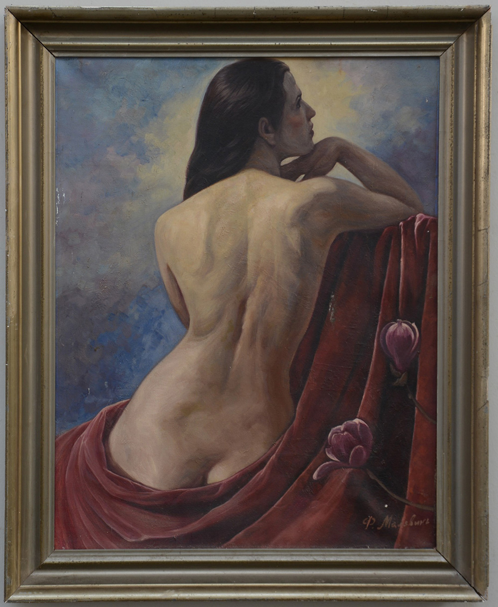 Firma indecifrata, "Nudo femminile di schiena", olio su tela (cm 68x52), firmata in basso a destra e iscritta al retro. (in cornice)