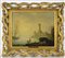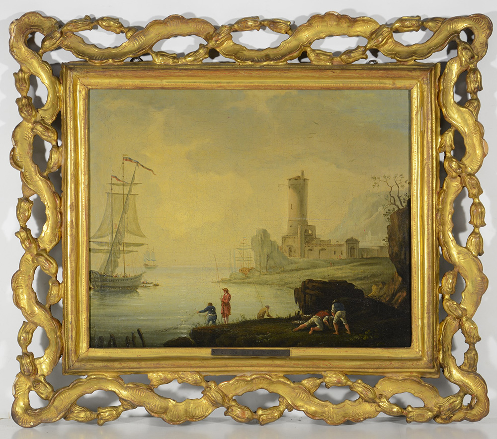Scuola del sec.XVIII "Paesaggio portuale con navi e figure" olio su tela (cm 40x50) in cornice antica in legno intagliato e dorato (expertise Prof.Dr.Migone che lo attribuisce a C.S.Vernet)
