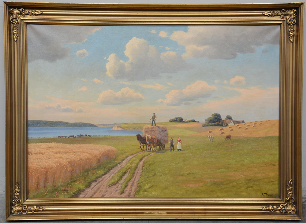 Firma indecifrata "Paesaggio campano con contadini e carro" olio su tela (cm 67x98) firmato in basso a destra. In cornice