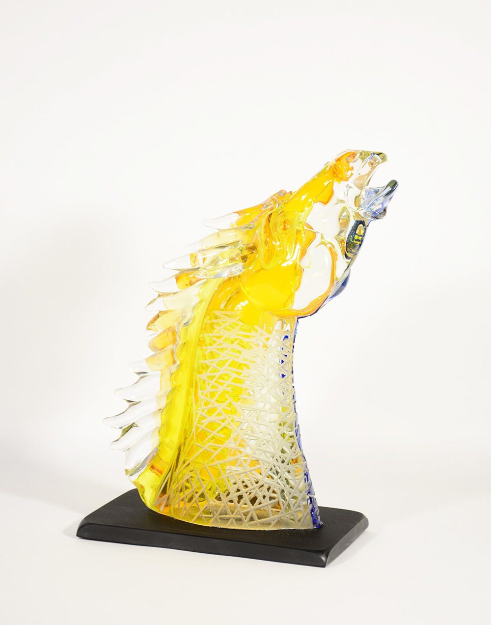 Manifattura di Murano, scultura in vetro policromo e inciso alla ruota raffigurante testa di cavallo poggiante su base squadrata (h cm 42)