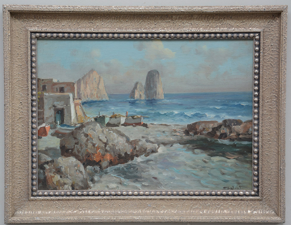 Firma indecifrata, "Marina con faraglioni" olio su masonite (cm 36x50)...