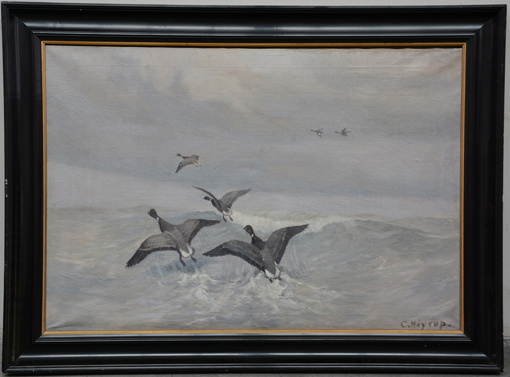 Firma indecifrata, "Anatre in volo" olio su tela (cm 63x93) firmato in basso a destra, in cornice