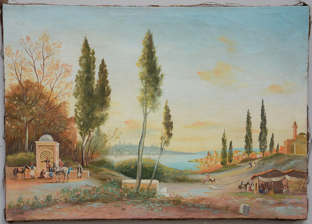 Ignoto, "Paesaggio orientale con figure" olio su tela (cm 49x70)
