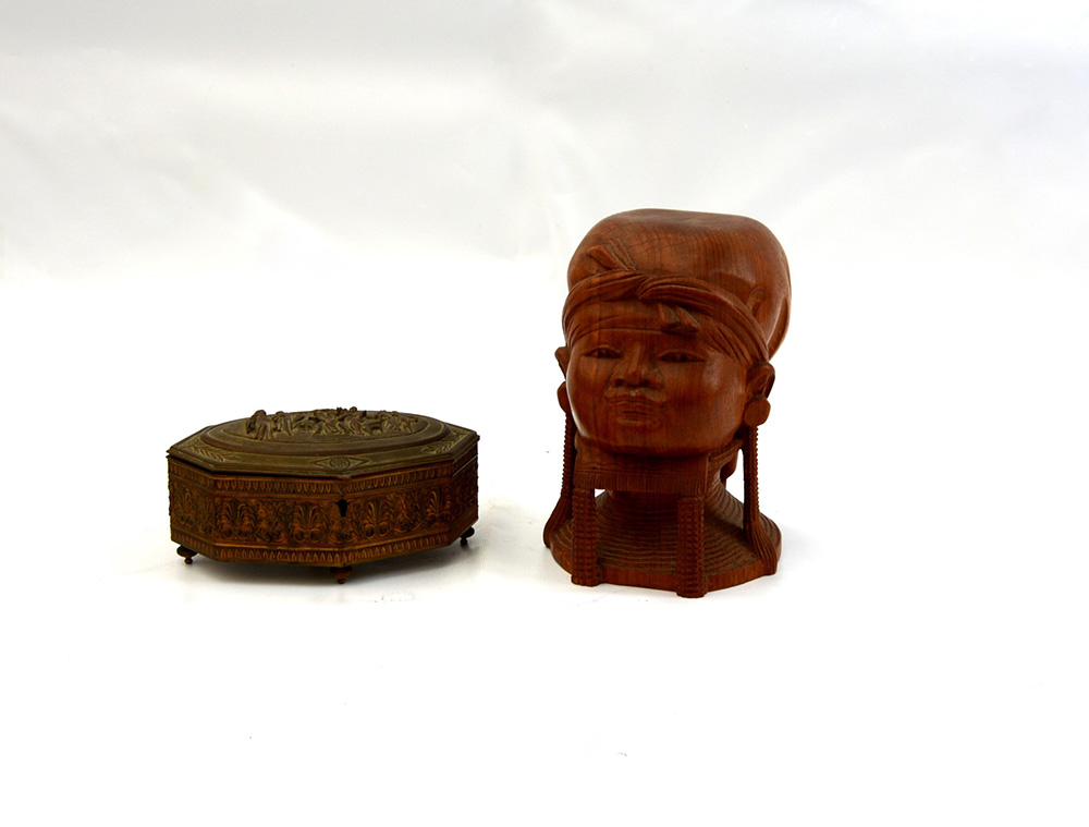 Lotto composto da scatola ottagonale in metallo e una scultura africana in legno raffigurante bambina.