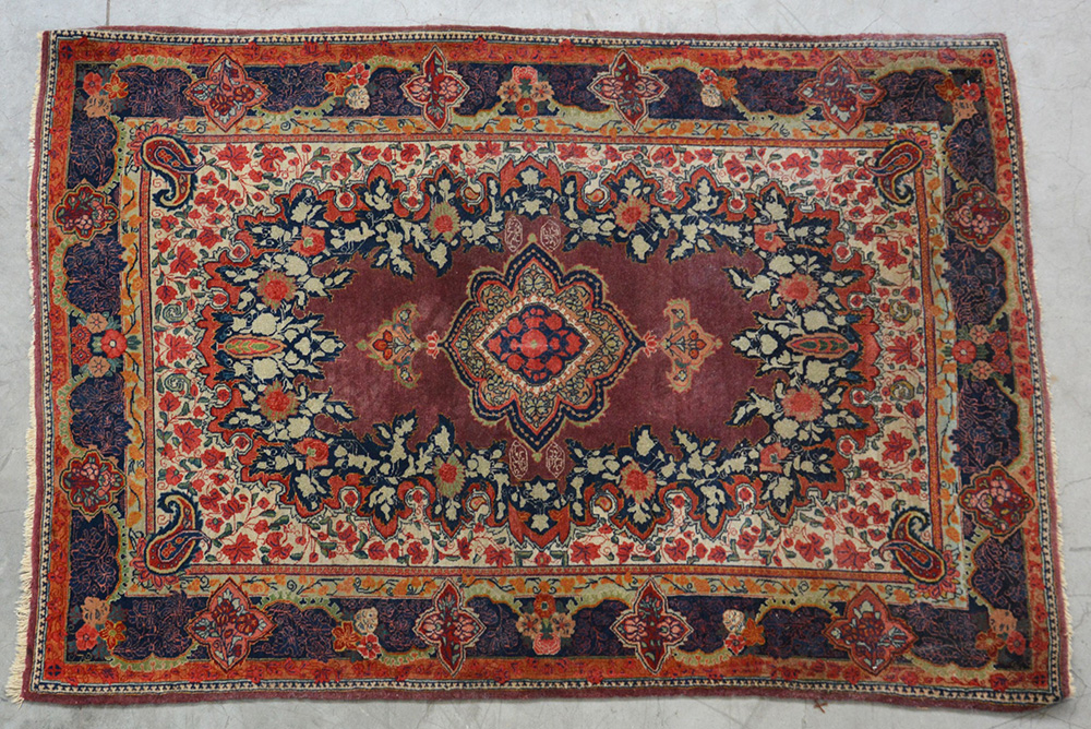 Tappeto Bdjar, Persia inizio sec. XX. Disegno a medaglione con puntali su fondo bordeaux. Decoro a fiori di ispirazione francese. Iscrizioni in lingua araba (cm 155x108)(difetti)