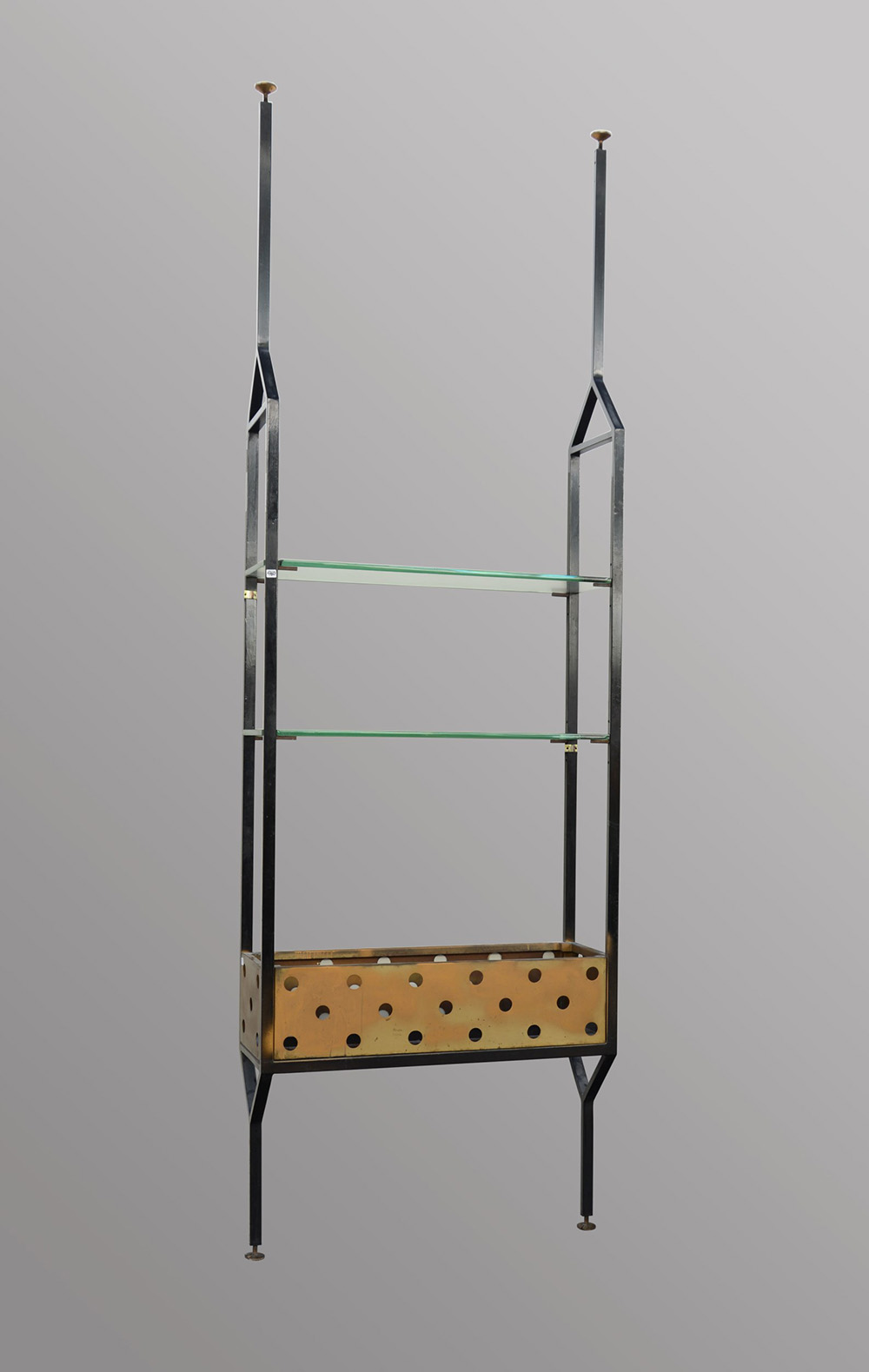 Libreria con fioriera con struttura in metallo laccato e ottone traforato. Piani in cristallo, anni '60 (cm 92z293x30) (difetti)