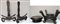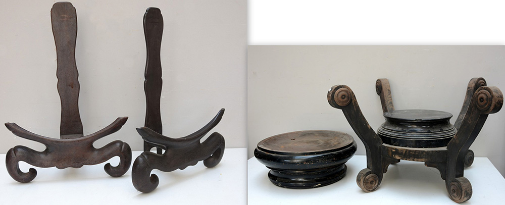 Lotto composto da due grandi basi reggi piatti in legno scuro, due basi porta cachepot orientali in legno e una base tonda in marmo nero (difetti)